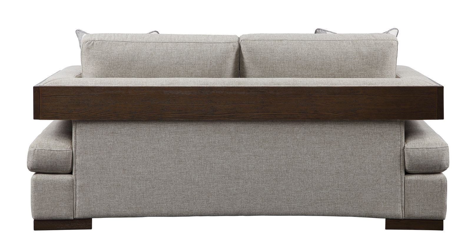 •Assembled, w/2 Pillows• Loose Back & Seat Cushion (2+2)• CONSTRUCTION• SEAT: Full Foam Cushion, Inside Frame: Wood w/Sinous Spring, "T" Shape Cushion (Reversible)• BACKREST: Cushion, Outside w/Wood Trim• ARMREST: Track with Outside w/Wood Trim• Wooden Wide Block LEG: Walnut Finish, Leg Size: 2 Inches Height• Material: Fabric (2-Tone Pattern)• Pillows: Square Shape (Contrast Pattern, {Removable Cover)}