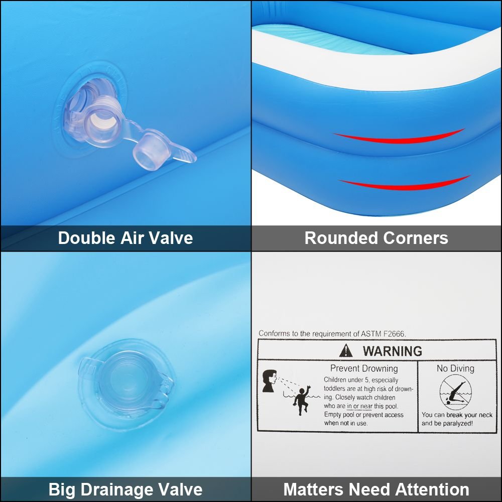 You are welcome to our shop today. We are so happy to introduce this 102" x 70" x 22" Inflatable Swimming Pool. With wall thickness 0.3mm, Made from high strength PVC material, sturdy and durable. The three-layer design makes the pool more stable and firm. Never worry about air leakage even when the swimming pools inflatable is completely filled with people. With our family inflatable pool, inflation will be a breeze. Don't hesitate to give it a try!