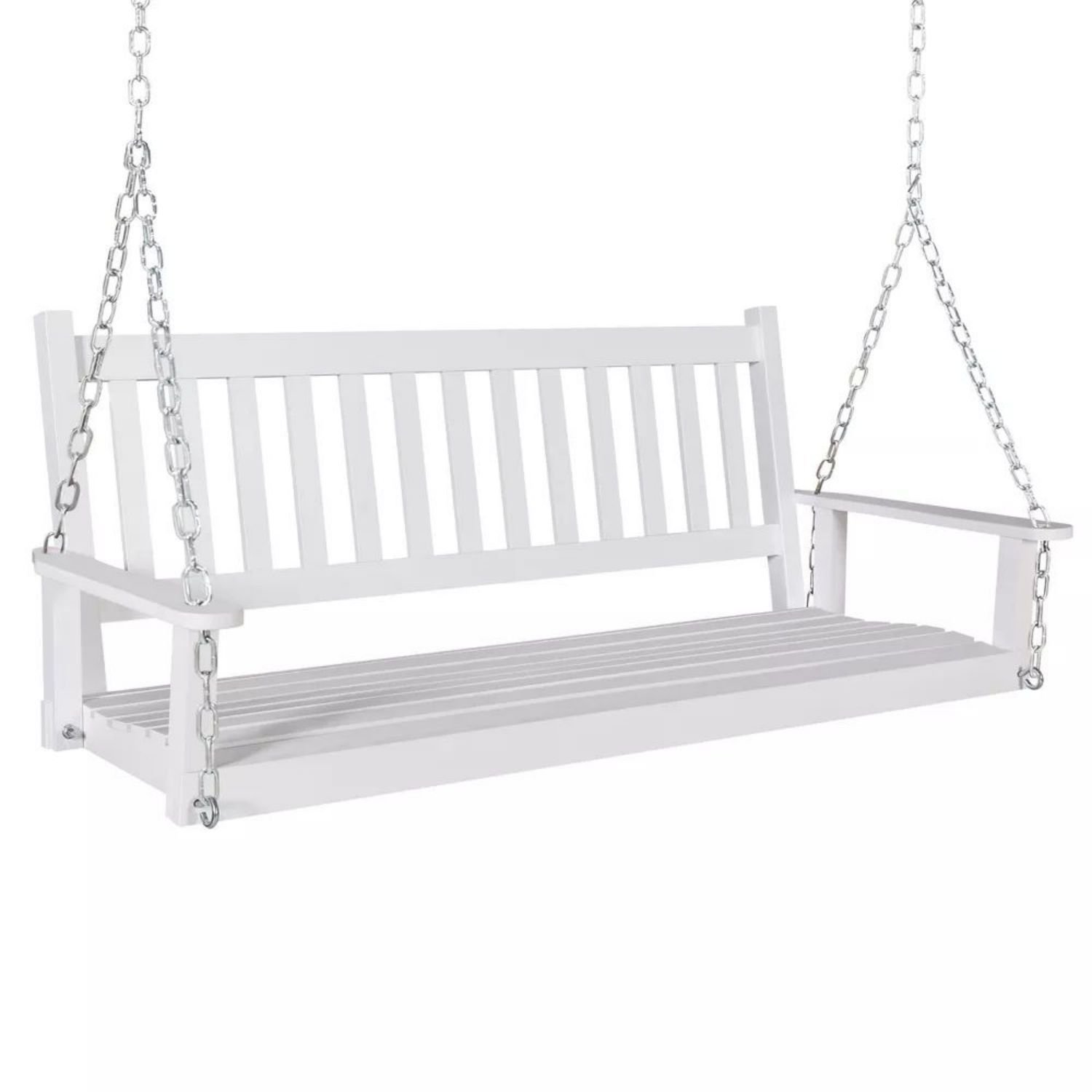 Outdoor White 2 Person Porch Swing is made of durable solid hardwood and holds up to 450 lbs;