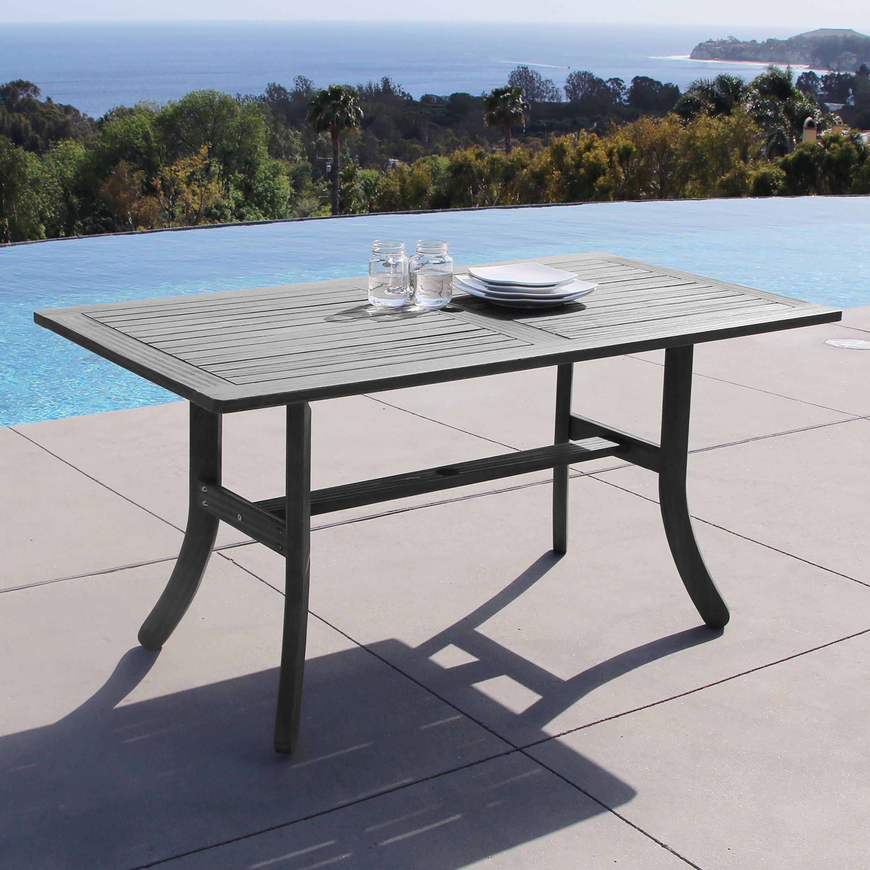 - Rectangular top, curve legs, with umbrella hole- Fast and easy to assemble- Made from Acacia Hardwood; Hand-scraped Wood Finish- Protective qualities: Weather-resistance, UV-radiation- Product dimensions: 59 L x 31 W x 29 H (inches)- Weight Capacity: 200 lbs