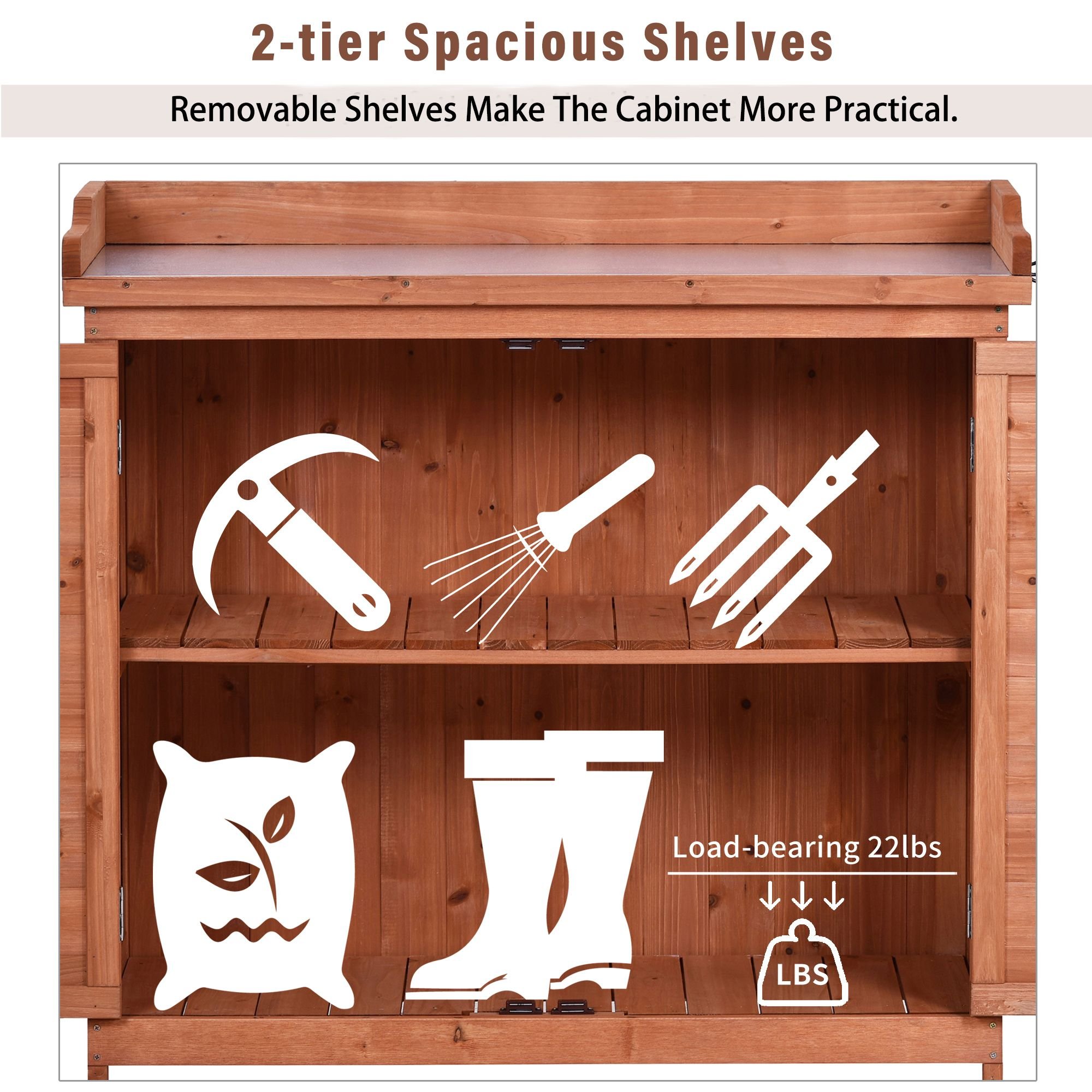 Ample 2-Tier Storage CabinetIf you are a big fan of gardening, this potting bench will be a great choice. With 37.4" total height, 2 ample storage shelves are designed to keep your tools handy and in one place without bending over or squatting.